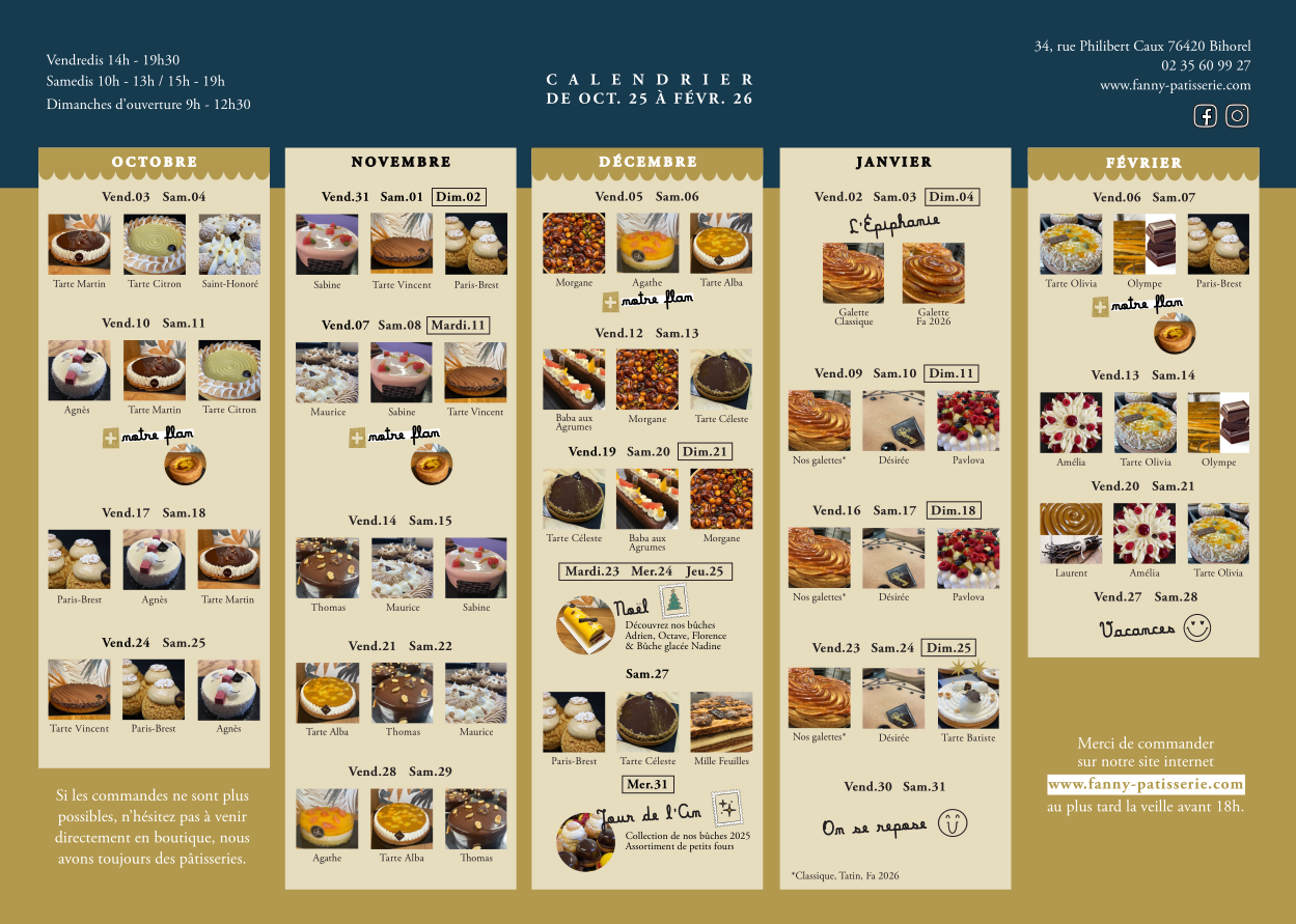 Commandez directement sur ce site, au plus tard la veille 18h, s'il n'était plus possible de commander, n'hésitez pas à passer directement en boutique car nous prévoyons toujours des pâtisseries pour satisfaire vos envies de dernière minute !
